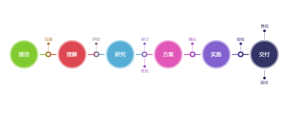 清晰、可視、可持續改進的研發流程服務,在每個環節我們都秉承著打造高品質移動互聯網解決方案的開發理念。